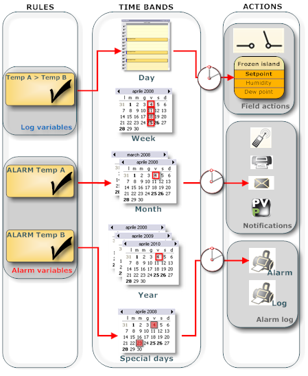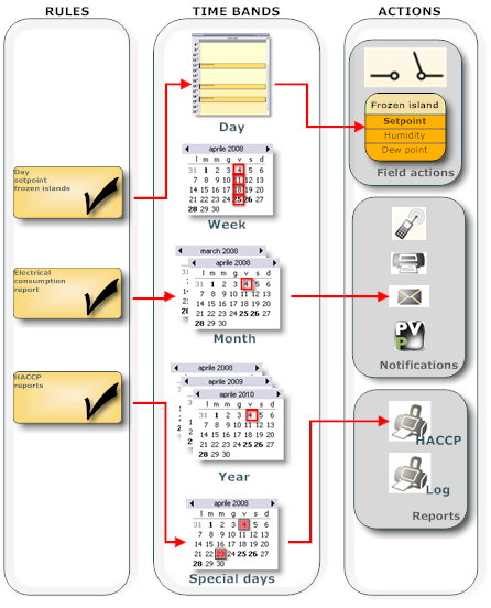 The notification action (i.e.: send a text message (SMS)), the field action (relay and variable settings) or print action (HACCP or log report) will only be triggered during certain time bands (i.e.: Monday at 8 am each month). Time bands are based on recurring calendars (daily, weekly, monthly, yearly) or special calendars (i.e.: at dd/mm/yyy at time xx).