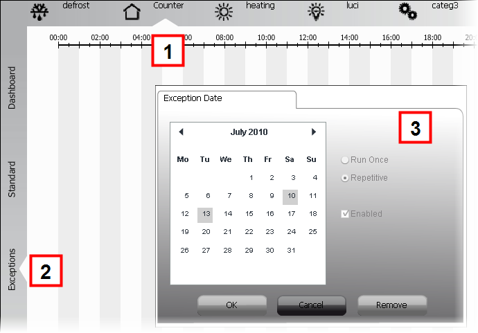 Click on a category [1] and on the Exceptions [2] tab: the window appears where you can set the event date, annual repetition and enable. Other days with scheduled exceptions are displayed.