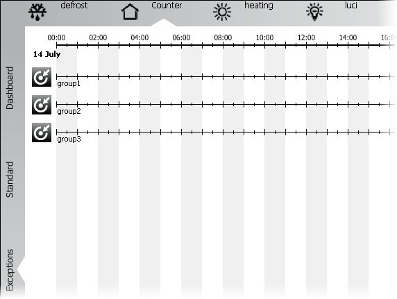 Set real-time rules (i.e.: set points) or long-term rules (i.e.: start/stop) in a weekly calendar. These rules are applied in the same way on all variables in a category (i.e.: lighting) while hey can be differentiated for different device groups (i.e.: showcase-lighting, closet-lighting). Manually set digital, integer and analog values on variables in the same group. Enable/disable group scheduling. |