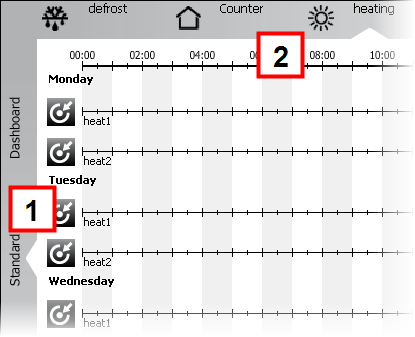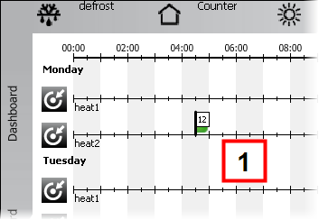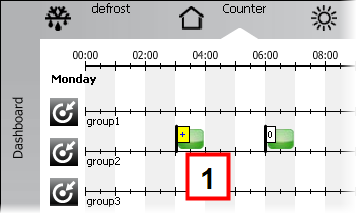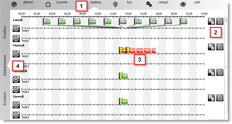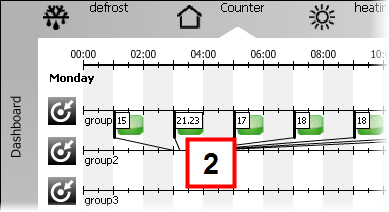 Up to 10 intervals can be set for each group in one day. Red intervals mean there are potential inconsistencies and interval overlaps. Resolve the problem before saving. In the event of two consecutive time intervals (i.e.: change set point in a mixed category) or overlapping intervals in the day, start/stop will not be run and only the integer/analog value will be changed. |