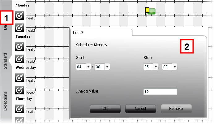 Use this function to assign values to analog and integer variables at a certain time of the day. Rules are repeated for all the weeks in the year. Exceptions can be created and repeated with priority over the standard calendar. |