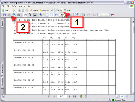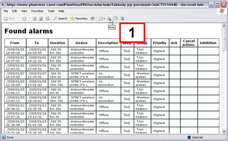 Various printouts some with fixed format (i.e.: alarm row), others customizable by the Installer (reports) are available in PlantVisorPRO Locale. All printouts are previewed in HTML or PDF except for alarm row printouts which are sent directly to the printer.